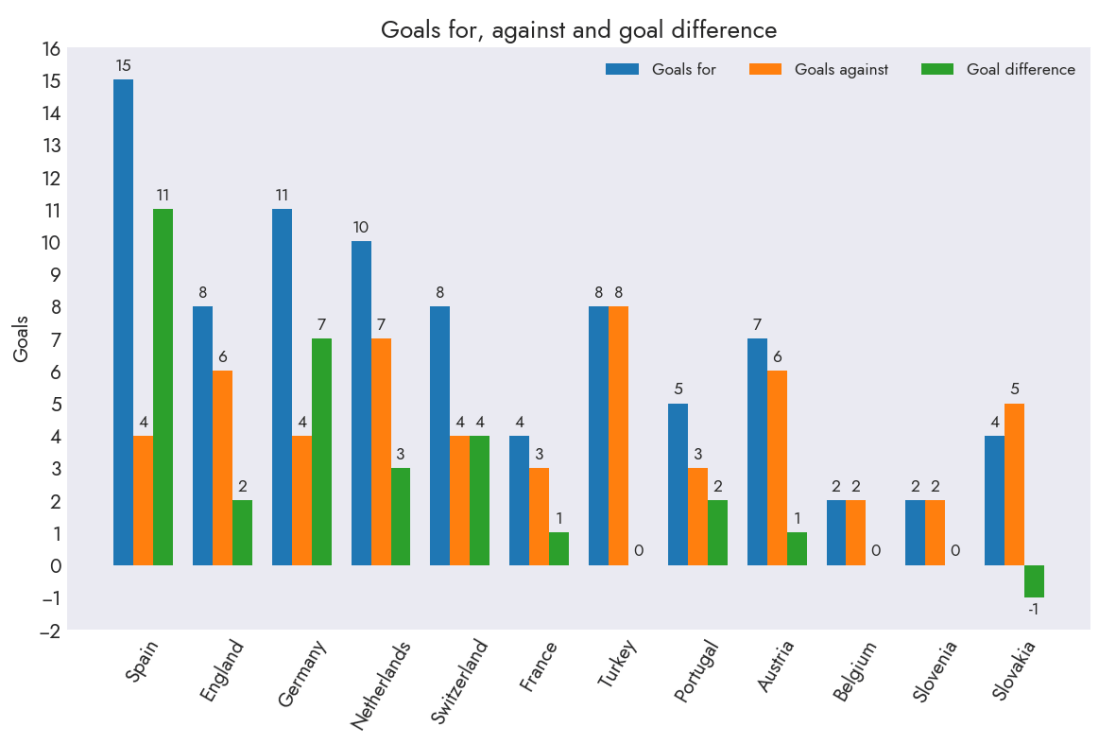 Even though it feels like football's never coming home, I still enjoy the buzz and excitement of an international tournament every couple of years. Sports statistics is another avenue for data visualisation I've been curious about recently so I thought it's worth delving into each team's performance stats using Python and Matplotlib. The code for … Continue reading Euro 2024 Tournament Data Visualised with Python